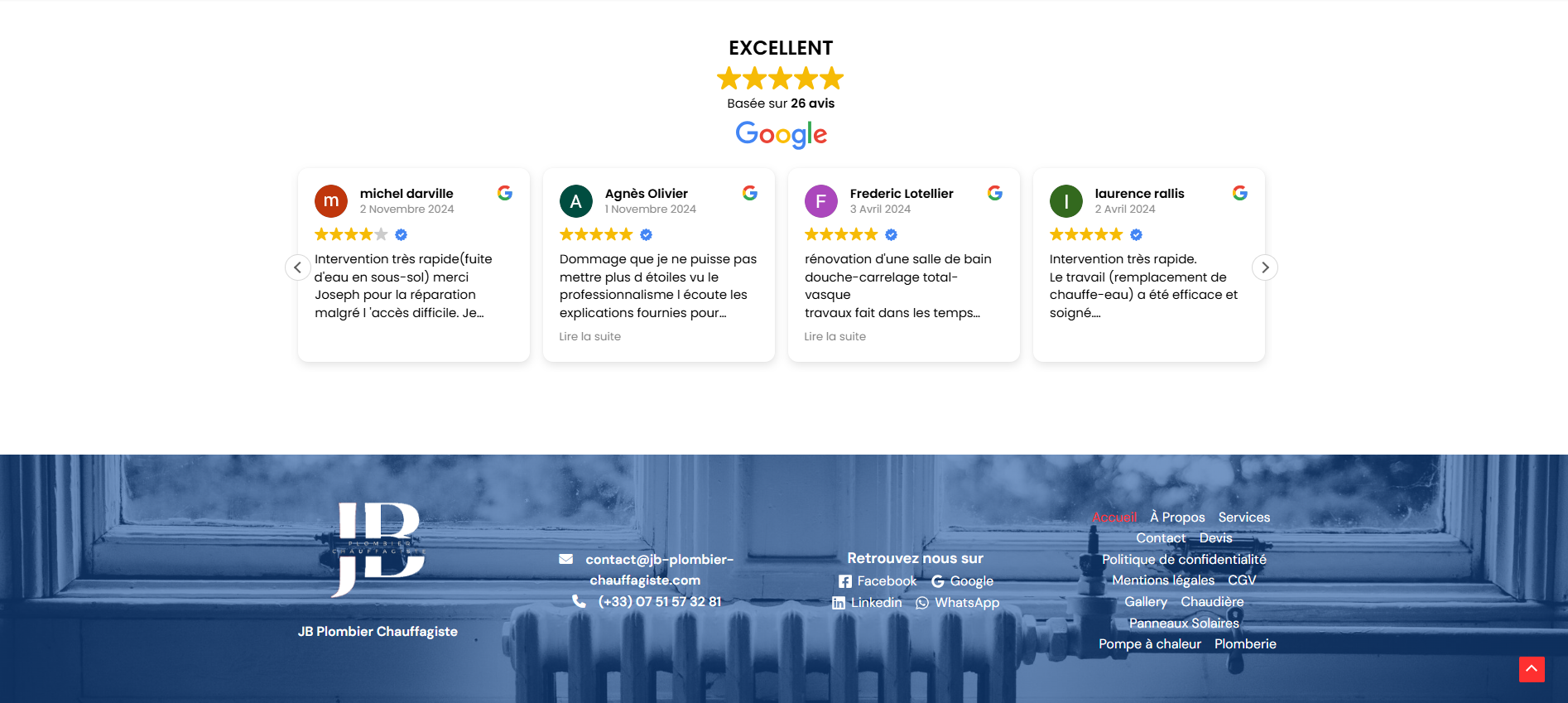 La mise en œuvre du site a permis à JB Plombier Chauffagiste de disposer d’un outil de communication professionnel, à la hauteur de ses ambitions. Grâce à cette nouvelle vitrine digitale, l’entreprise gagne en visibilité locale, renforce son image de sérieux et améliore l’expérience utilisateur pour ses futurs clients.