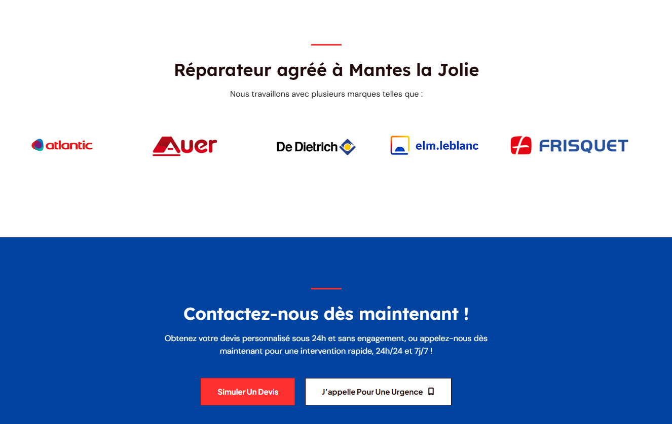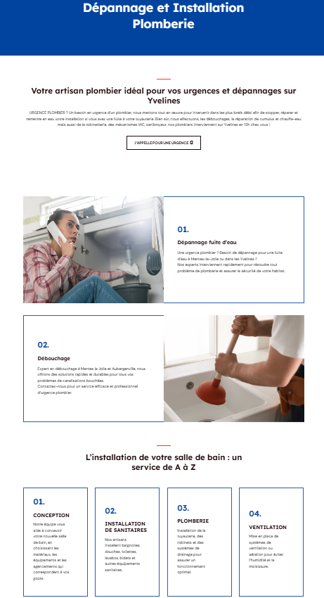 Le projet incluait : une architecture claire et structurée pour permettre aux visiteurs de comprendre rapidement les prestations (« Plomberie », « Pompe à chaleur », « Chaudière », « Panneaux solaires »).